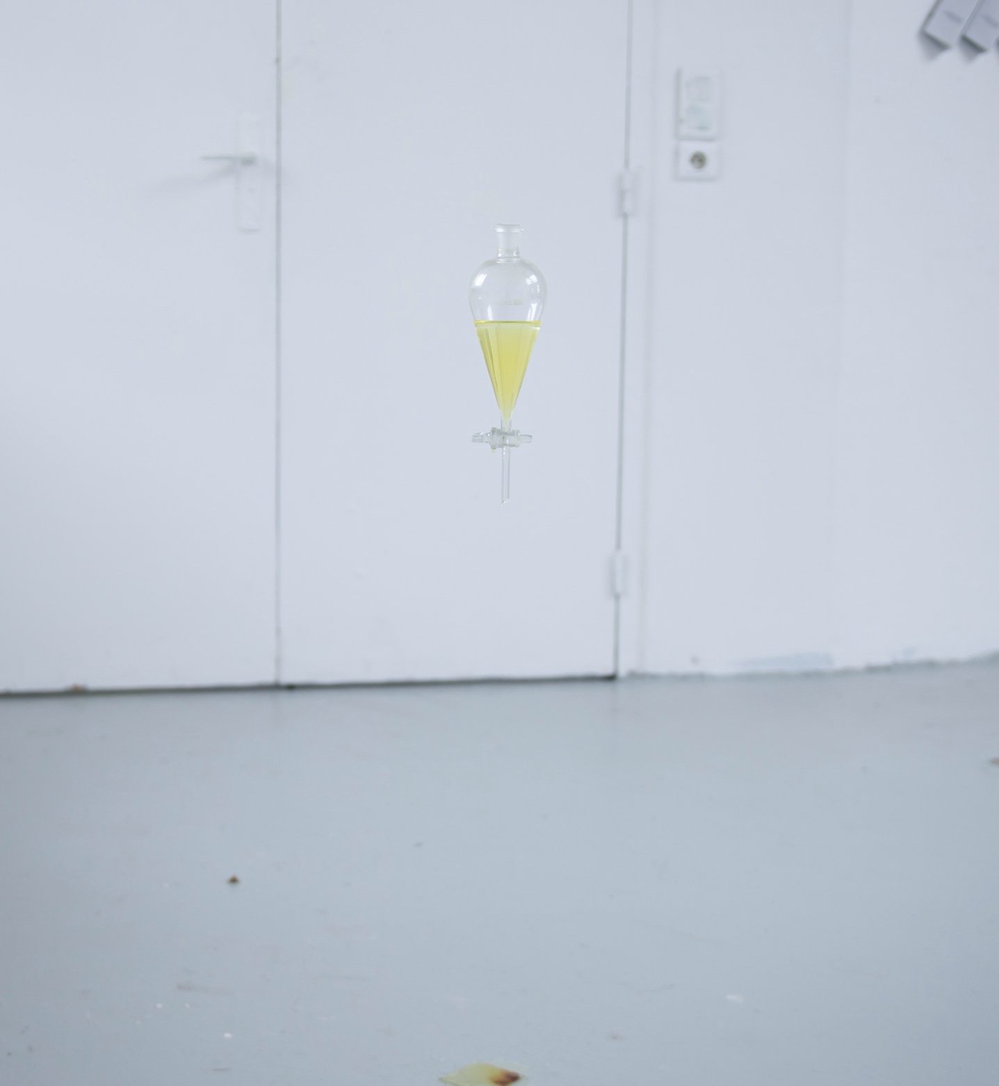 This is the performance of a bleeding image, the trace of the laser fades and then disappears. The object, once everything has drained away, is nothing but a square of glass. The dropper marks a rhythm, and the piece, repeated in the spaces, follows suit. The viewer experiences it, both visually and physically.